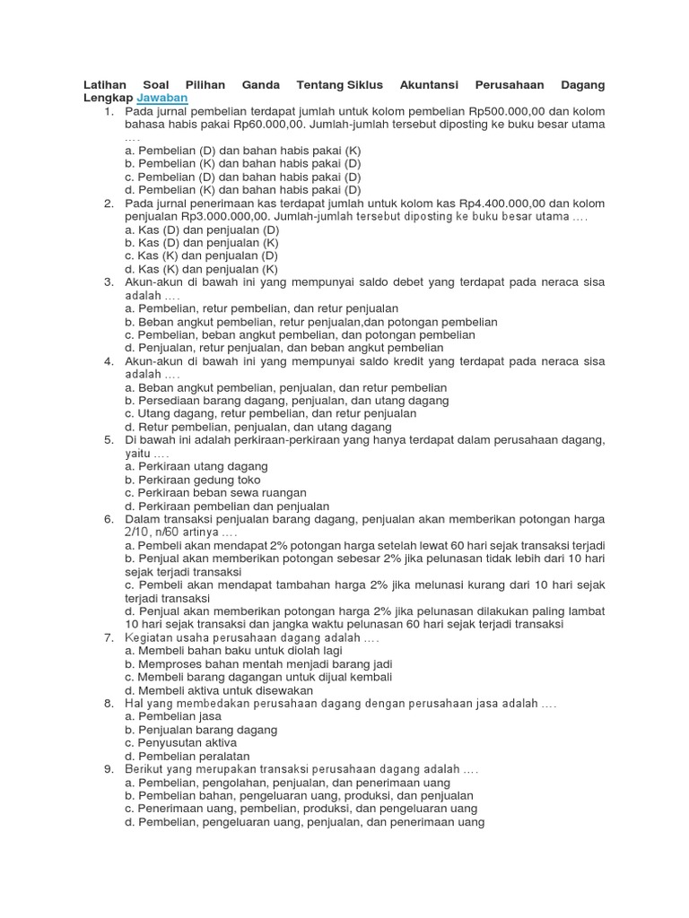 20210326 contoh soal hitung dagang kls x xi xii smk. 50 soal pilihan ganda tentang akuntansi beserta jawabannya. Latihan pilihan ganda perusahaan dagang. Perusahaan ini kegiatan utamanya bergerak dalam pelayanan jasa konsumen bukan produk yang kasat mata. Komputer akuntansi kelas xi jilid 1.